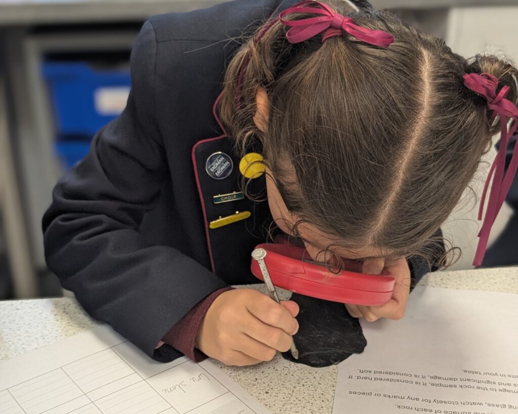 Through hands on investigations, the pupils observed how rocks react to water, tested which rocks float or sink, and explored how hard or soft different rocks are. They used magnifying glasses to make careful observations and shared their ideas using scientific vocabulary.