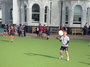 Four House teams competed in the pancake tossing relay, with the frying pan and pancake as the baton. Each House were represented by a team of eight, featuring two pupils from each year group and captained by their House captains. As the pupils run, each pan carrier has to toss their pancake at two marked stations along the way.